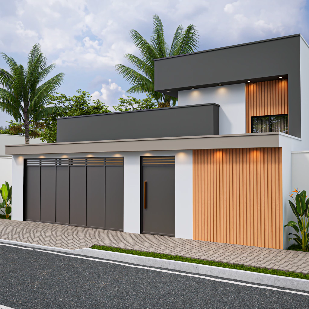 - Imagens Fotorealistas do Projeto: perspectivas em 3D que simulam o resultado final da obra, ajudando na visualização realista da fachada e dos ambientes internos.
